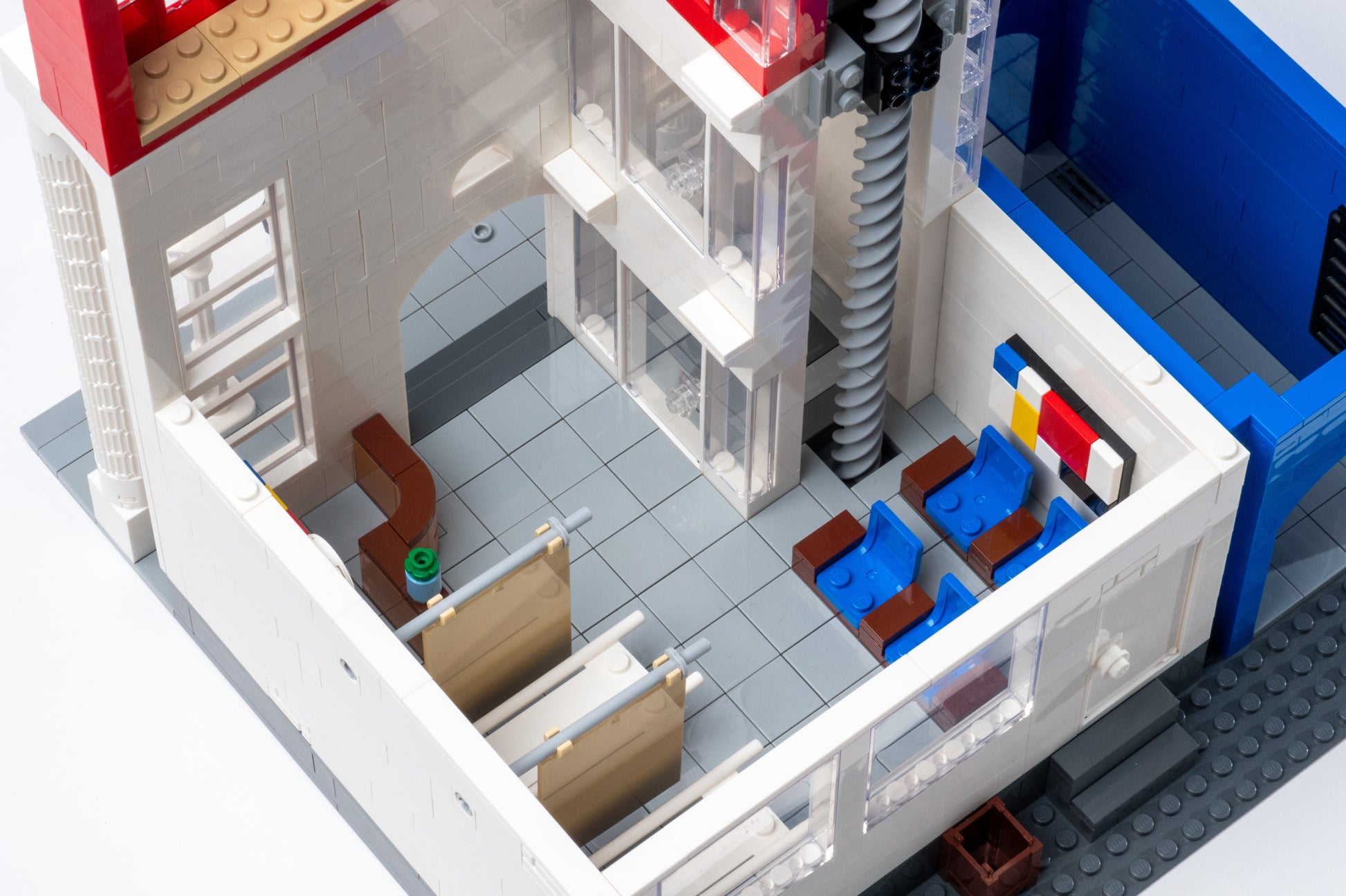 In the hospital, you’ll find a modern lobby with a cozy waiting room, and an emergency room. A quick ride up the working elevator brings you to the state-of-the-art operating room, x-ray room with working light-brick projector, and vending machine snack area.